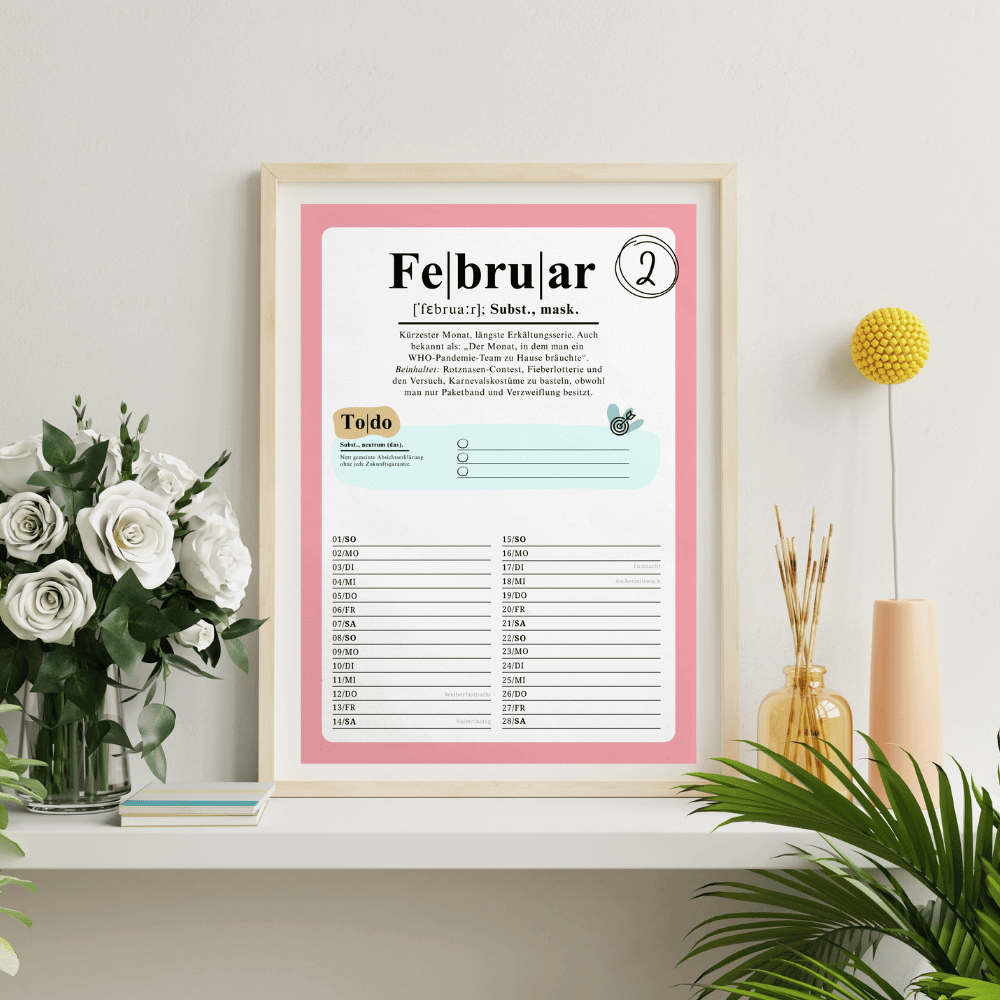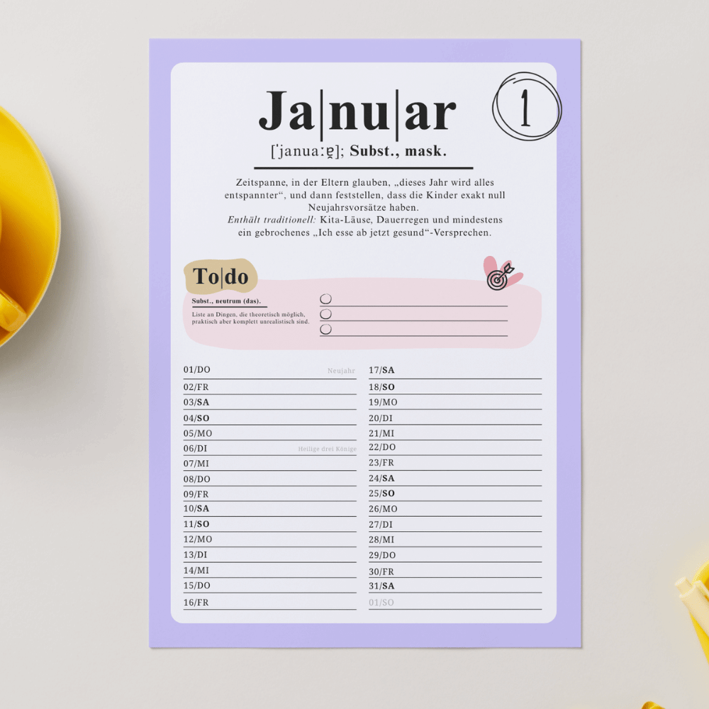 Der Kalender zeigt zwölf herrlich ehrliche „Duden-Definitionen“, die den jeweiligen Monat so beschreiben, wie Eltern ihn wirklich erleben:
